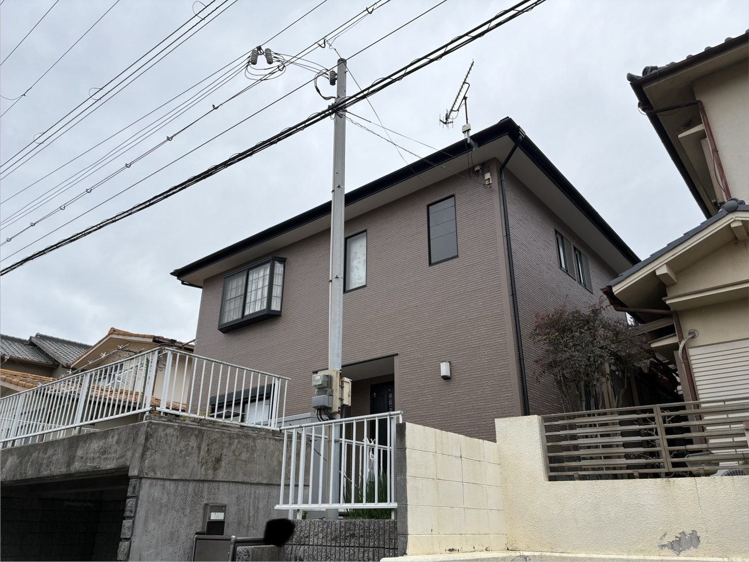 高耐候性で長持ちする日本ペイントの『ファインパーフェクトトップ(外壁)』と『ファインパーフェクトベスト(屋根)』をご提案しました。外壁は明るい白からシックなブラウン系へカラーチェンジすることで、重厚感のある洗練された仕上がりを目指しました。